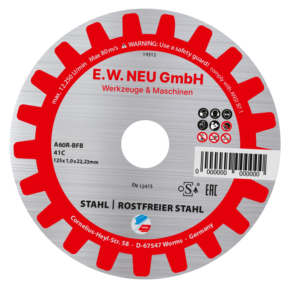 Nur noch solange der Vorrat reicht: Trennscheiben E.W. NEU Eigenmarke. A60R-BFB, für Stahl & rostfreien Stahl, 125x1,0x22,23 mm
