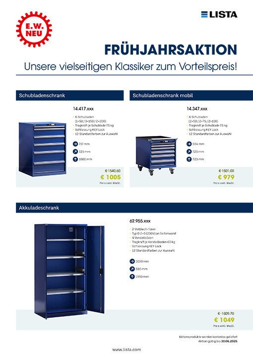 Machen Sie Ihren Arbeitsplatz bereit für den Frühling! Entdecken Sie jetzt die exklusiven LISTA Frühjahrsangebote und bringen Sie maximale Ordnung sowie frischen Wind in Ihre Werkstatt oder Produktion. Ob bewährte Schubladenschränke oder robuste Werkbänke – sichern Sie sich Schweizer Premium-Qualität zu attraktiven Aktionspreisen. Starten Sie effizient in die neue Saison und statten Sie Ihren Betrieb optimal aus.